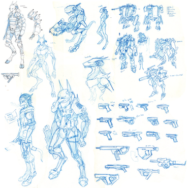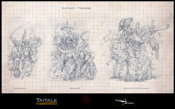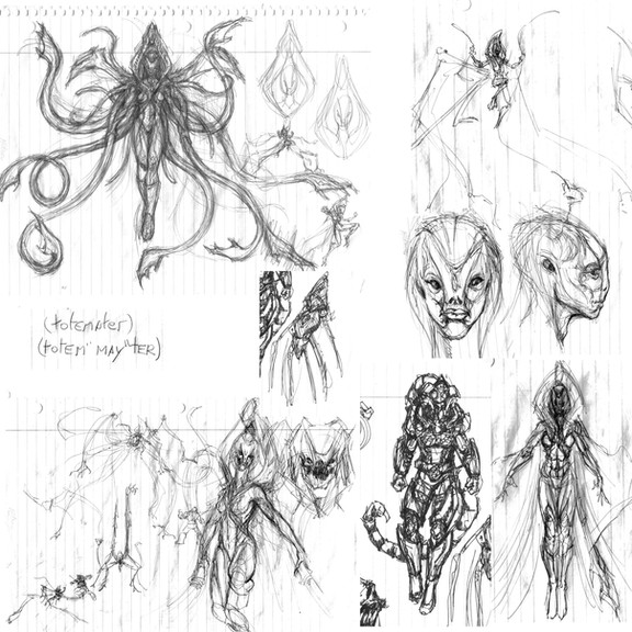 I owed you some nice aliens, so here you have them.Early developmental sketches of playable races with a rather more xenobiologic feel for the upcoming MMORTS game Novus AEterno by TaitΓ‘le Studios.