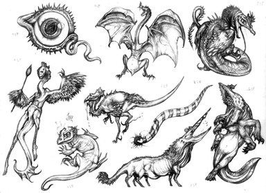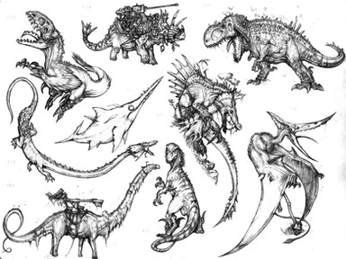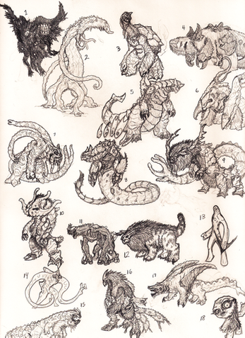 This are conected to this other post, [link] if you remember or even read the text (Does anybody read the whole thing I'm writing in each post?) This game was supposed to be a fighting game with a couple of different elements, among them I avoided to mention another one so to make it clear or this post. On each stage there would be neutral creatures, smaller than those controled by the players but ... you know, biting around and bothering the players that are peacefully trying to kill each other.383) Bone lizard: Analogous to Pluvial, this creatures would crawl on the trees and can whip really hard with those tails, but would mostly make to the atmosphere of the stage. Now, it is like 6 or 7 meters long, moslty tail though.