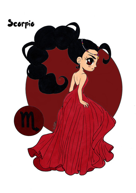 I had a request to draw Scorpio next, which happens to be my moon sign! So here she is! This one was tough, I had troubles coming up with ideas, but I think it worked out!Here's the rest of the series so far: