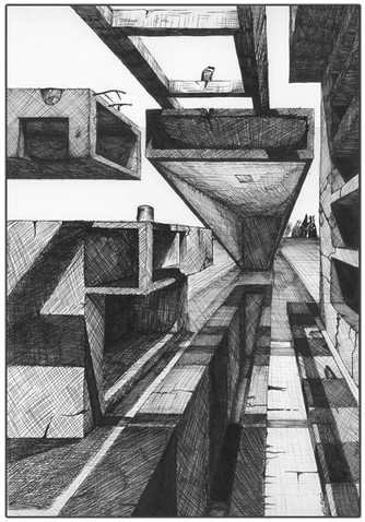 compared to your other drawings, the ones I saw anyway, this one is a lot more subtle, and I like your experimentation with using only 2 colors. I think it's great. the red orbs, they may be seen as limelights or a hand holding on something.... very creative. Good job man!