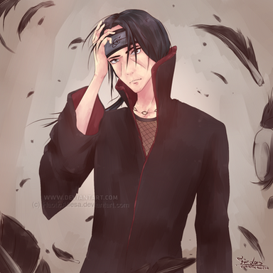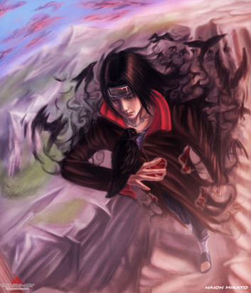 Good job with the dark colours and textures, they add a sinister feeling to the picture. I've seen other Itachi pictures and they most of them have black feathers, why is that?