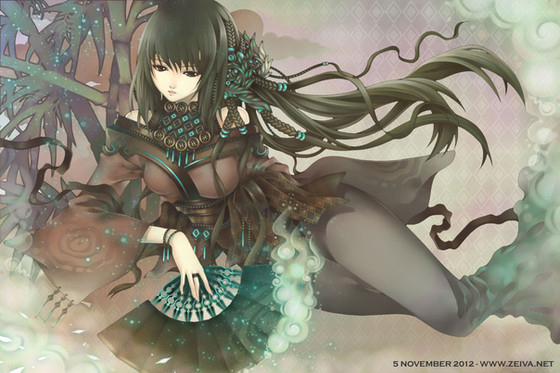 This is like stunning! I love the design of clothes. It looks like the traditional ninja clothes but with a modern and sexy twist. I can imagine her standing up with that light fabric floating around her. It's exceptional!