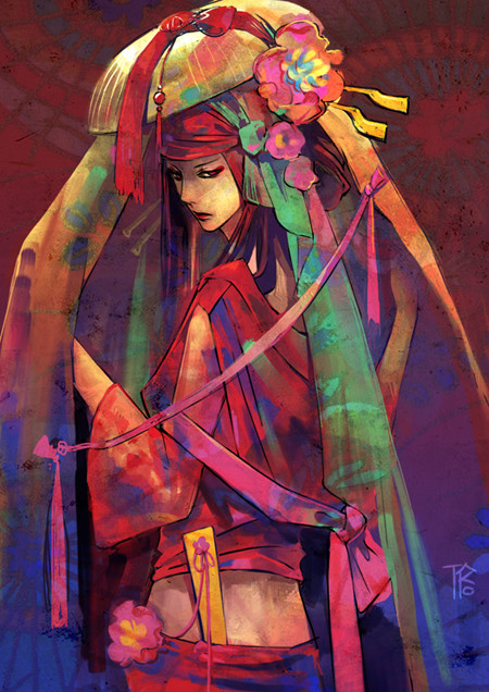 her outfit it wonderful, you are very good at drawing folds in clothing. i love the hair and the stick thingy through it great pose and use of colors!
