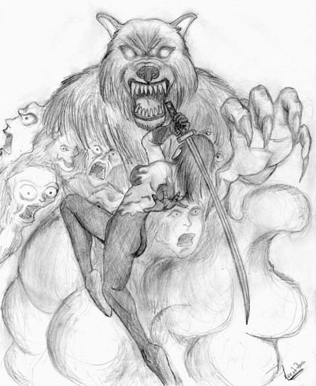 The werewolf is scary; he looks like one of the Red Talon tribe from Werewolf:The Apocalypse.