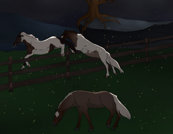 The fall came early, bringing strong winds and heavy, ice-cold rainfall. The small group of mares were blinded in a desperate search for cover. The foals were their first priority to shelter against the harsh elements and somewhere in the midst of finding all the young ones and herding them to shelter, a young medium splash mare became separated from them. She could barley hear their calls as the wind rushed through the air. Noting of which direction the band went, she quickly took shelter between some pine trees. Their thick bunch of needles protected her against most of the chilling rain and crazed wind. Not able to catch a wink of sleep, she waited out the storm...Fallowing the muddy trail made by her herd, the irregular overo mare quickly but carefully trotted her way down the path. Her steps light enough to only kick up the slighest of mud. However, a white shadow has been stalking her. He too was lost due to the storm, driven away from his home before a major flood. She sensed no danger from him but rather something else. When she flashed her lime-green eyes in his direction, his own icey orbs met hers and the handsome devil smiled. His long and flowing crimson mane and tail she noticed almost at once. He was a little underweight but other than that his form was naturally slim with powerful muscles rippling beneath his white hide. He knew she wouldn't be an easy one, but that was perfectly fine to him. He liked the ones that gave him a good chase the most. He will reel this one in slowly...