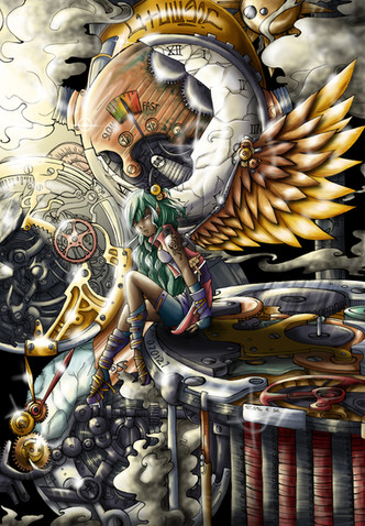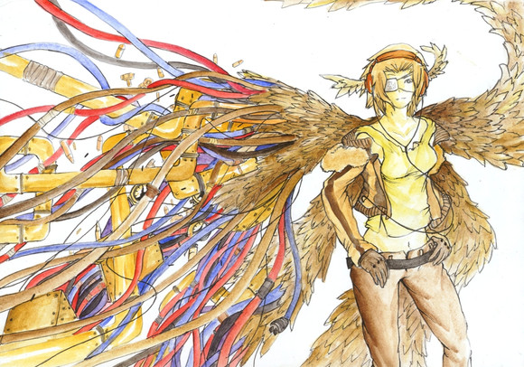 Whoa...I really love this! So much gorgeous detail...particularly the debris falling below. The wings and mecha parts are also really well done! ^^