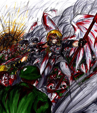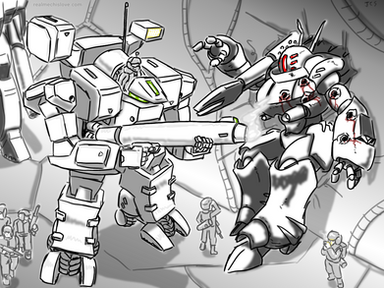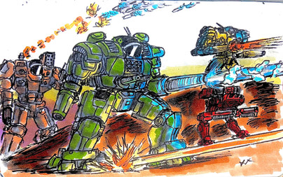 Wow... I spent a really long time on this. More than a week, that is.It's Macross fanart, as one might gather. There are a handful of glaring errors, the most major of which being the size of the Q-Rau (the green robot), because I'm pretty sure they're a lot bigger than that when compared to Valkaries. Other than that, though, there's a shitload of detail and some good color work.
