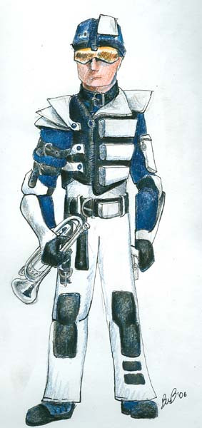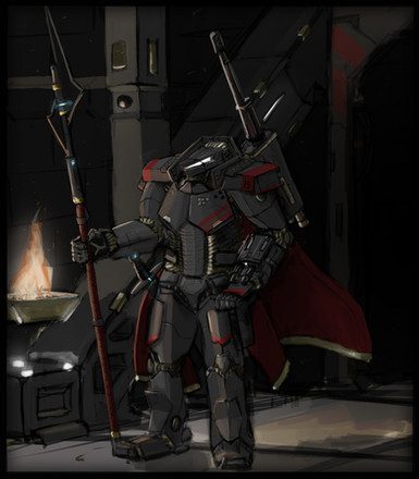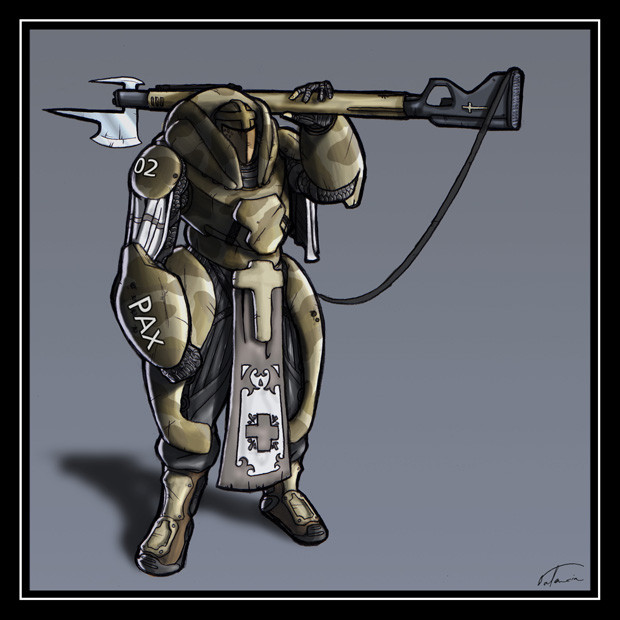 Someone's gotta hold the flag.CrossBolt Shutze in full armor. I like the flak cape and the mask-scarf thing.