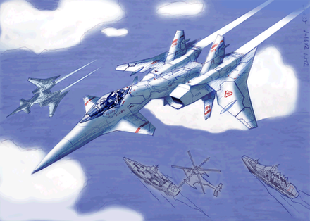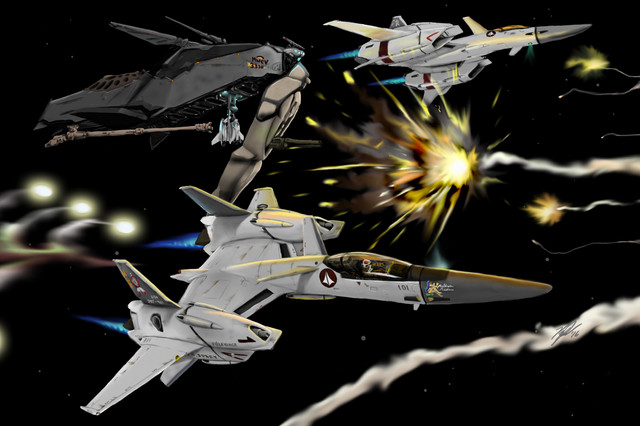 Max is in the blue Valkyrie...My first piece of Macross fanart.