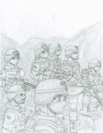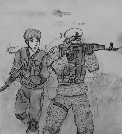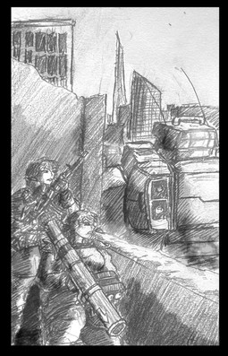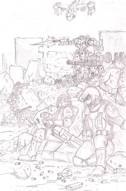 I tried to be as faithful as I possibly could to 's style... even gave Wes that baseball cap when he SHOULD BE WEARING A HELMET! I drew a minimal amount of inspiration from an old Dreamcast game I have, Gundam: Rise from the Ashes. Since it takes place all over southern Australia I thought of the burned out cities and stuff for an environment.