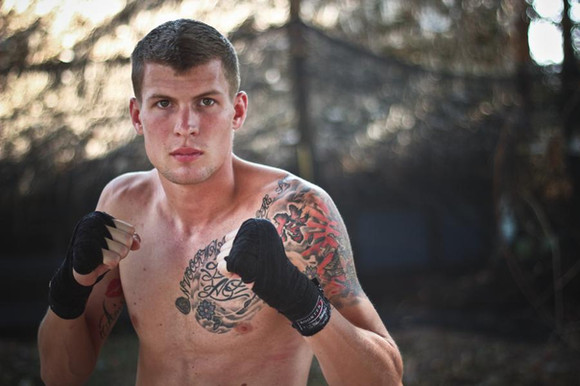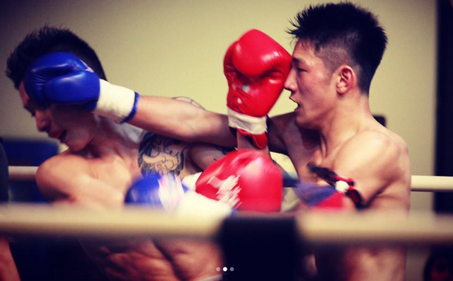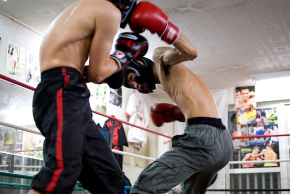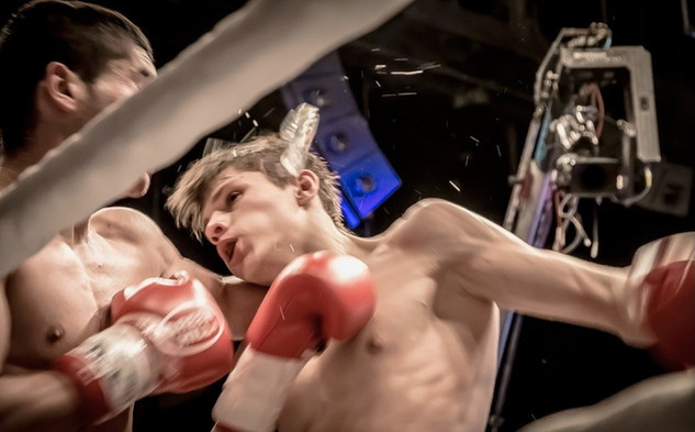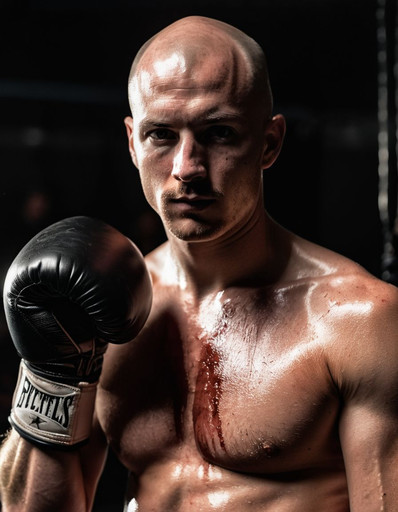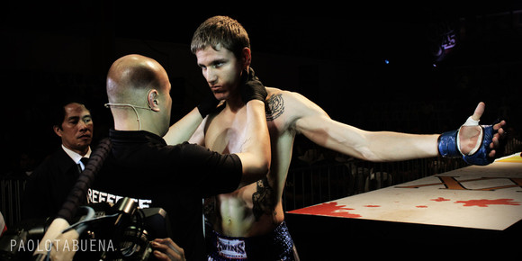 A Muay Thai fighter covered in blood and awaiting to see if his bloody opponent is fit to continue.Bangla boxing stadium, Phuket, Thailand.