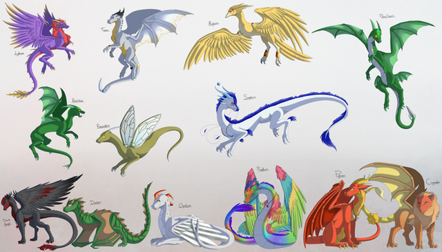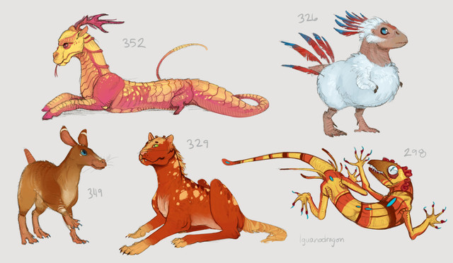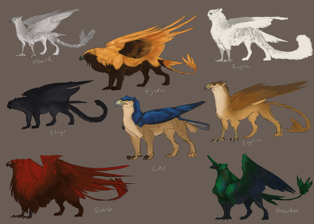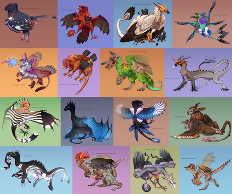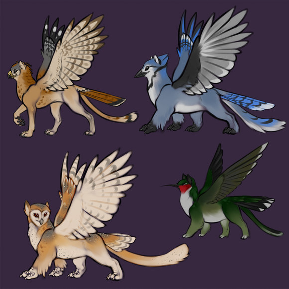 Six stupidily simple gryphons, some have sneks as tails, some others have suspicious scorpion tails... but all of them are poisonous so it doesn't really matter.From left to right animals I used to make these awful things: