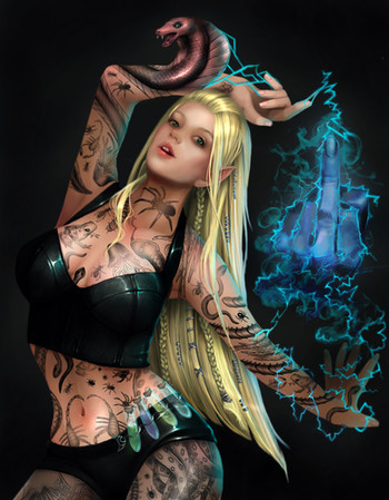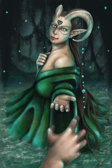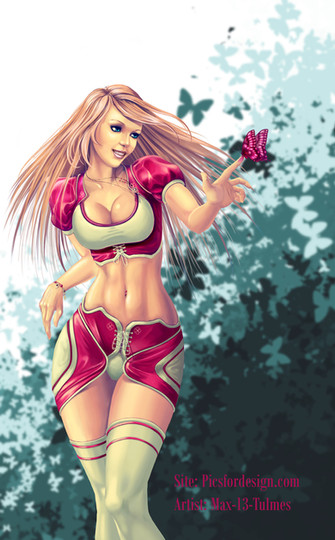 Gorgeous detail on her corset and panties, and the background when you look at it at first looks like a rumpled sheet with a woodland print, so you're not sure if she's standing up or lying down. It's very sensual. Well done, hun. xx