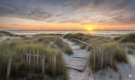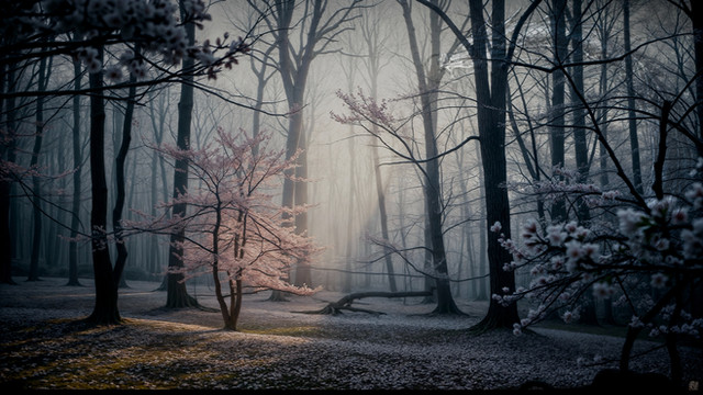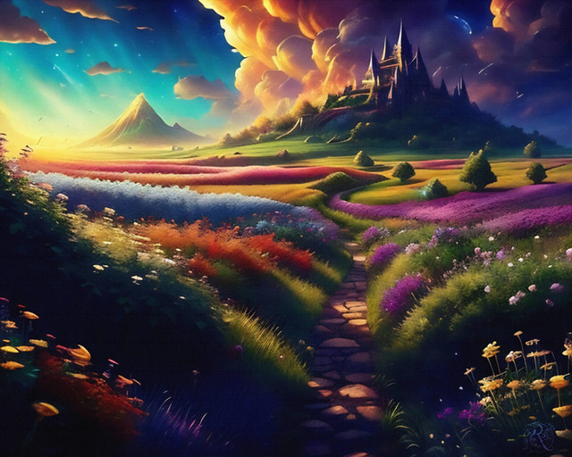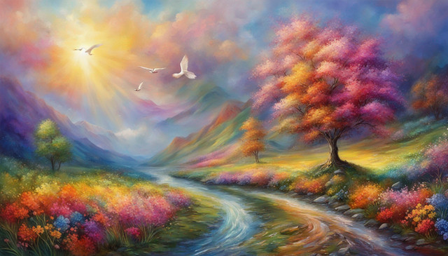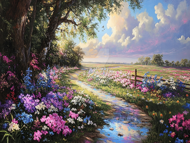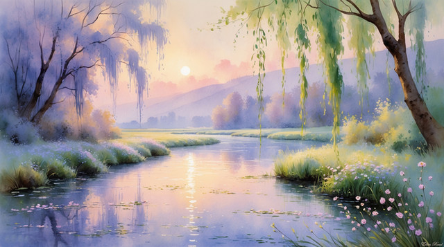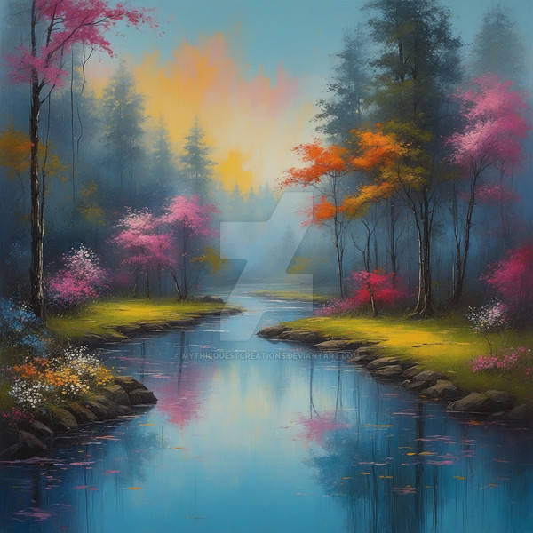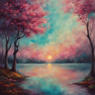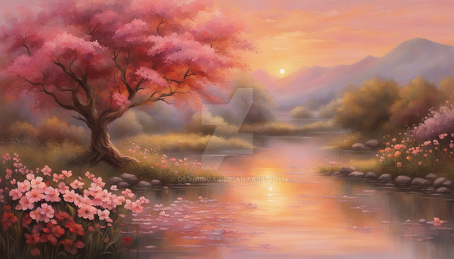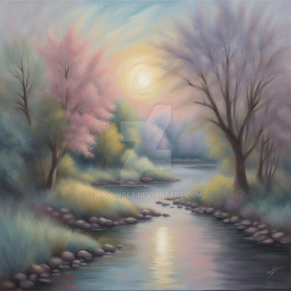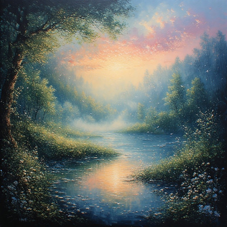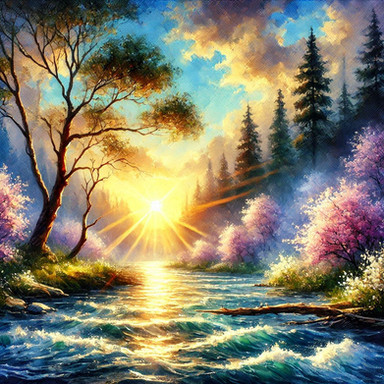 "Embrace the magic of spring at sunrise with this tranquil masterpiece. The sky transitions from deep indigo to soft pastels, casting a warm glow over vibrant flowers in full bloom. A meandering stream reflects the morning sunlight, as mist adds an ethereal touch. Birdsong and the sweet fragrance of blossoms complete this serene scene, inviting contemplation and joy."