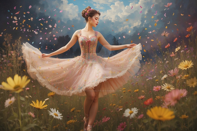 With each pirouette, a flower blooms, Nature's brush, her dress consumes.Β