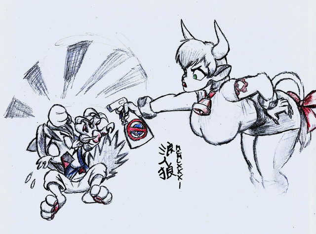 Gyuko has a different look in this one, as she her compatriots have been given a more chibi-fied look. This is not their canonical design, as the chibi look was done for a more for comical effect. Gyuko grabs a dromaeosaur that leapt at her by the ankle, slams it into the ground, raises it by the ankle again...and proceeds to stomp a mudhole on its head.