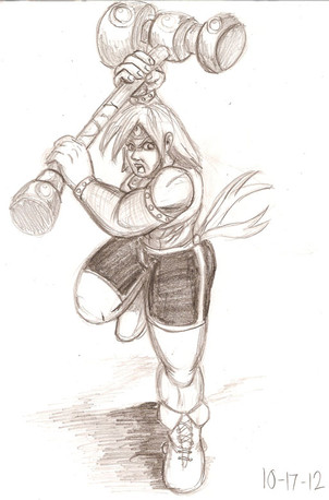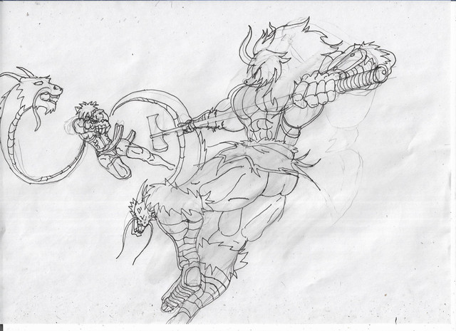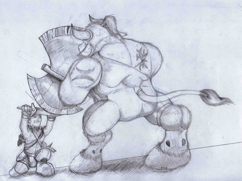 In my yet unnamed story, Gyūki are the race with the elemental affinity to Earth. Harriers are the ones that belong to the Air; Tritons/Merfolk to Water and the Dragonkin to Fire. At the moment, I forgot what name I gave to the Dragonkin (I know it was a Mandarin name). Anyways, Gyuki are freakishly powerful creatures; but it is a male-dominated culture. There have been very few examples of female warrior Gyūki throughout their history. Those who have been lauded in legend have a status comparable to Valkyries. The Gyūki culture is heavily based on Viking and Native American cultures (I was aiming for the Sioux). Gyūko was the one who decided to break away from the tradition of being utilized as a bride and breeding cow for her tribe. Growing up, she trained herself to be as strong as the greatest Gyuki braves known in Gyuki history. But, as rebellious as she was, she also caused much grief to her clansfolk with her alcoholic tendencies. It wasn't until she came in contact with a young Harrier (a younger being who ultimately tamed the savage woman that she is) that her life changed for the better. As the elemental compliment to the avian Takaji, she contributes her geokinetic abilities to the elemental foursome, alongside the Harrier Takaji.