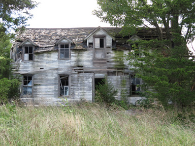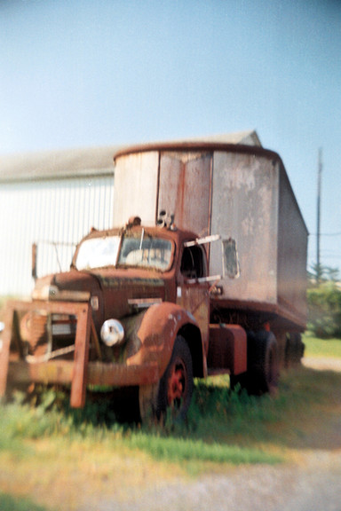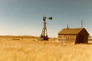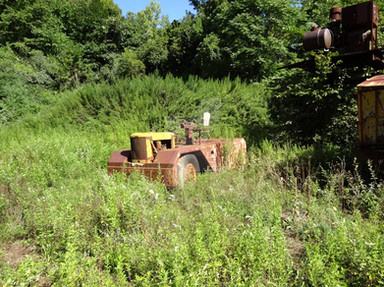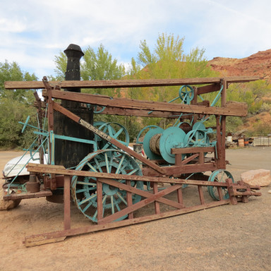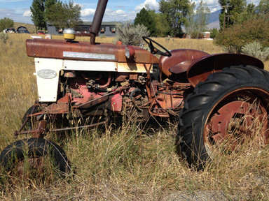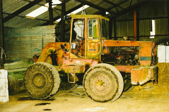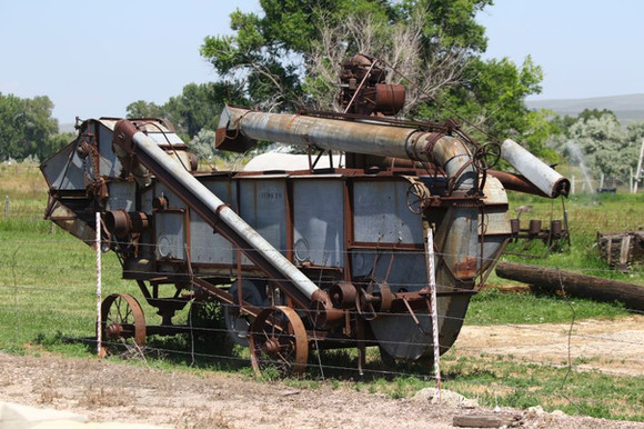 Ranch near Glenns Ferry Idaho, 2019.An old yellow John Deere scraper. Parked with the road grading equipment.