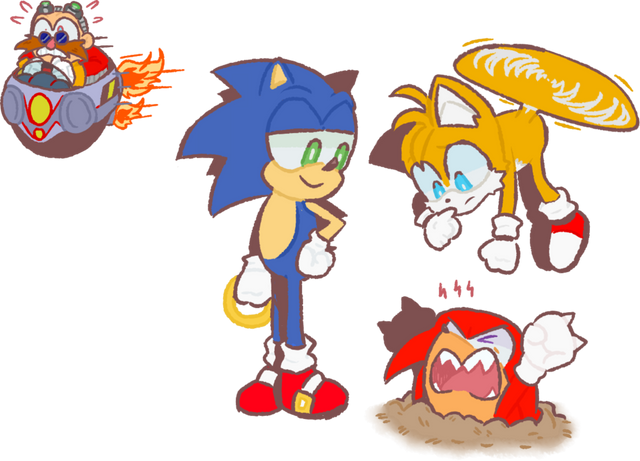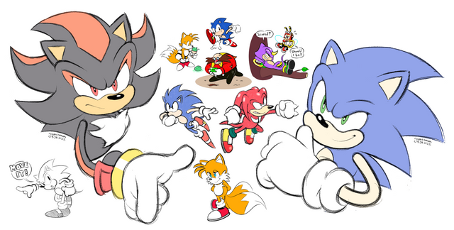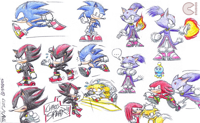 Hey wouldja lookit that! Not stiff boringnessPracticing expressiveness in bodies and faces, cuz heaven knows I need it. I also used more colorful shadows than before (I've learned a lot since making these guys' turn arounds ). And I know they have hands, but seeing Sonic characters with toes just creeps me out. Paws paws paws, please. ...I think I might be the only one that feels that way