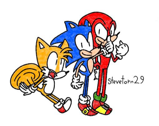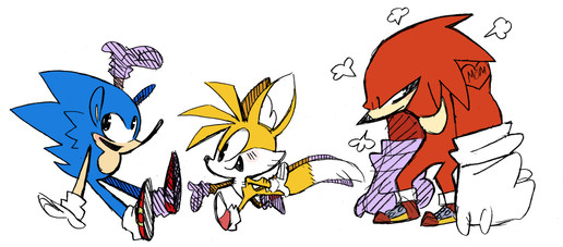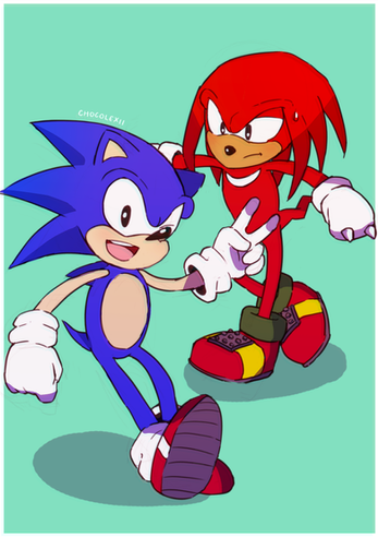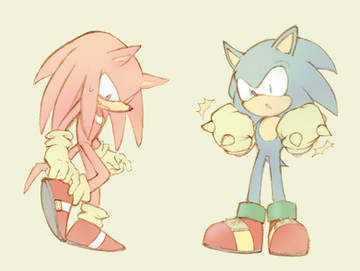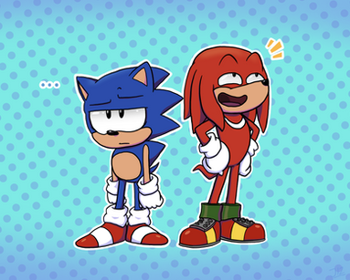 but, they have their laughs!I like to think Sonic is always trying to befriend Knuckles since he seems so stoic and isolated, and he likes to get a smile or laugh outta him all the time, even though he kinda doesn't understand that giving Knuckles too much attention can stress him out.