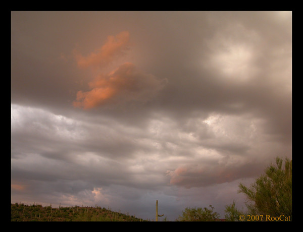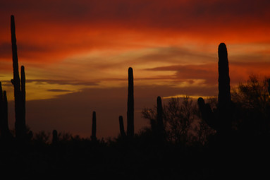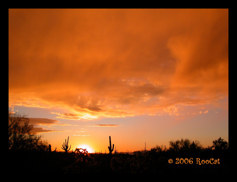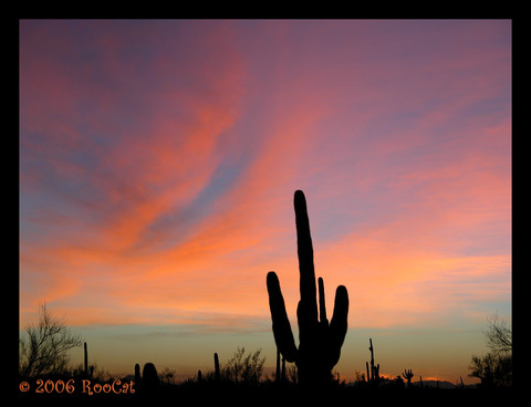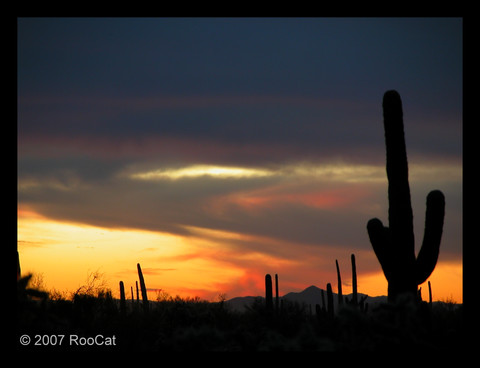 The final of the Golden Rays sunset photos with saguaros, palo verde trees, creosote bushes in the foreground and distant mountains. Taken a couple of minutes later than the third one with the light almost gone. I like them all equally well so decided to post them even though they are similar except this one. First one: [link] Second one: [link] Third one: [link] Taken 10 July 2010.Unedited, ©, and Framed.