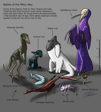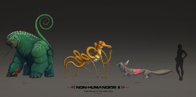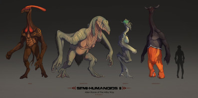 Notes: Wommo is a race of sapient alien critters with a single elongated compound eye and doubled flowered mouth lips located on the sides of the head. However, though the uniqueness of the Wommo’s skull is undisputed, the most notable feature of this race is long frontal limbs used for locomotion and hindlimbs thrown on the back of the creature and utilized primarily as arms.