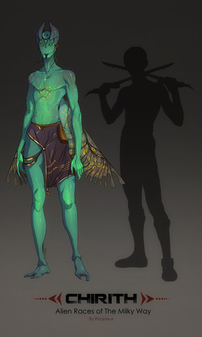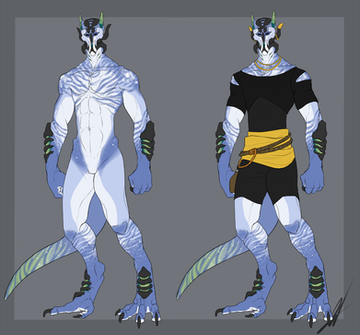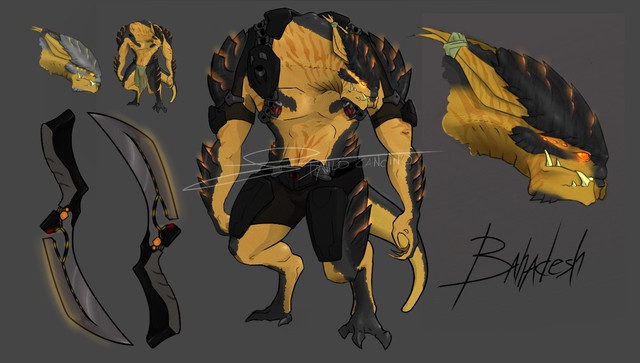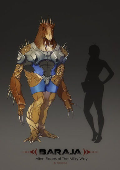 Notes: A reptilian-like sentient species with amphibious traits, the Baksha hail from the primarily tropical moon known as Senigai. The species is distinctive for the reinforced armor build of overlapping gilded scales that are extremely strong; yet, acutely thin. Moreover, the physical appearance of this species is marked by large hardened eyes that have unique skeletal structure inside them protecting from sudden butting of their own species during the mating season.