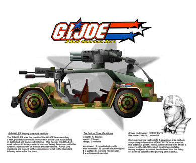 The GI Joe VAMP - a high speed, multi-purpose attack vehicle.This is the most common configuration. It features a dual M2 weapon system, which is aimed via a passenger side laser-guided control device. The design is based on the Lamborghini Cheetah, modified to keep the styling and functional essence of the VAMP from 1982.