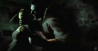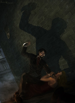 Wonderful work. I love the poses both the vampire and the corpse hold. The vampire, in particular, looks as if he were yanking his coat away from her grip. The corpse is just wonderfully tossed down on the steps without any care. Brilliant!