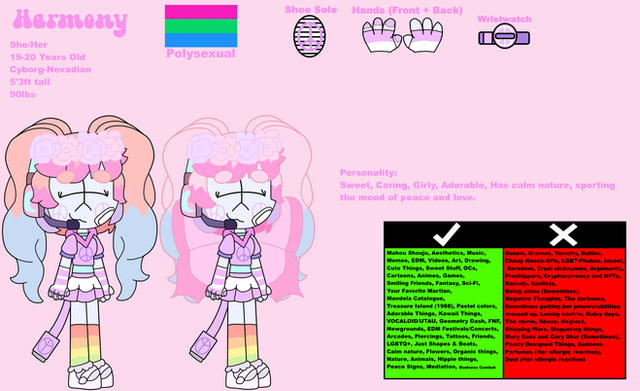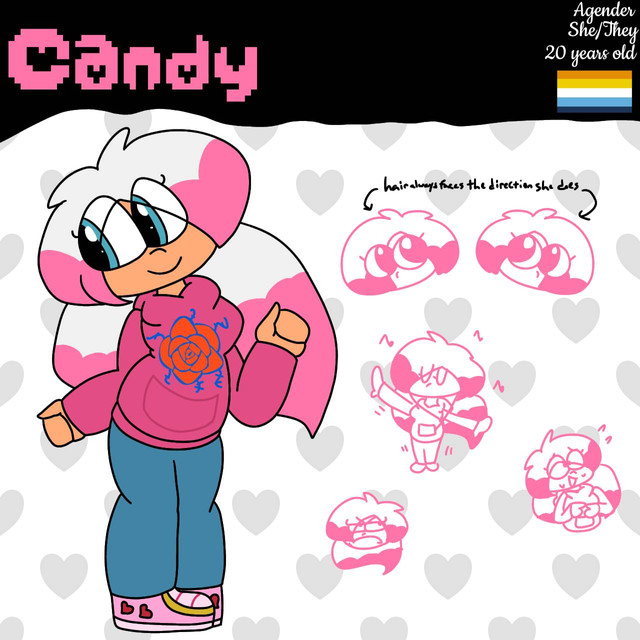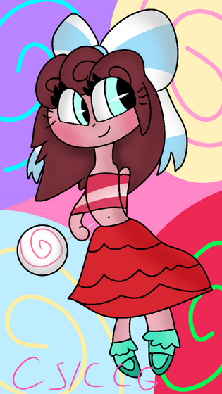 Candy finally has a refffff. Seeing as how my birthday is on Saturday, I thought that for my early birthday present to myself, I would make a reference sheet for my main OC, Candy. Yes, her real name is Candace Roselia, but she thought that name was too uptight, outdated, and didn't fit her at all. So, she just refers to herself as Candy. A small rundown on her personality: Candy is easy-going, introverted, and has a lot more going on inside than she lets on. She's generally sweet (get it) and tries her best not to upset anyone, though once in a while she gets fed up with being nice. Her main passions lies in art, like music and video games. Even though she likes to be alone, Candy has a very tight friend group in Bella and Julie. When she's around them, she opens up a lot more. She is a lesbian (she doesn't want sex though), and has said her main type is energetic and kind-hearted girls with a sassy side. Enjoy the sweet girl.Related content