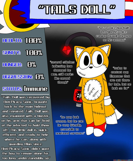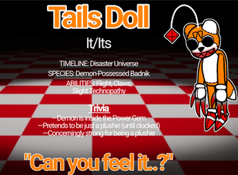 After all this time, Tell-Tails gets a new ref! Her beast form got a redesign, and she has a new marketable plush form! I want to explain why she looks so strange. Tell-Tails is a literal assault on the mind, so she looks like something you can't comprehend. You can't help but think "What the fuck am I looking at?" I've also come up with how Tell-Tails relates to Sonic outside of resembling his little bro. She's a myth in his world, essentially being their Annabelle. In this case though, it's real. And she won't be held back by a little glass box.Related content