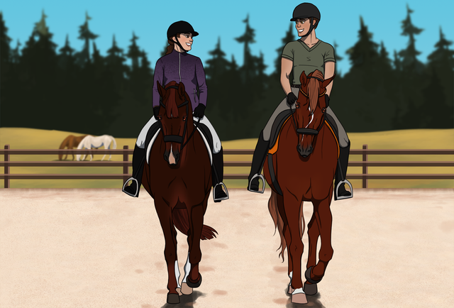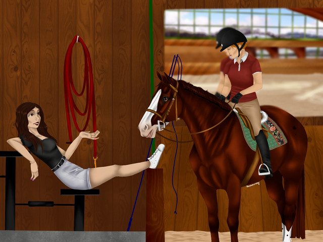 “Alright, back up again.” Mikayla said, offering Steph her cupped hands to help her onto the absurdly tall stallion’s back. Mikayla wasn’t exactly tall, and the horse’s withers went over her head easily enough.