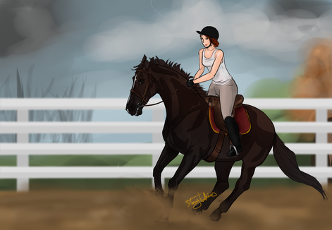 His person very carefully tied the reins together and set them against his neck. He stayed as still as possible, though he was so giddy, all he wanted to do was prance around. She put one foot in the silver triangle thing and swung herself quickly over his back. She wasn't as heavy as the large saddle and the sack combined, but her weight did distribute quite differently in comparison. Now they flew, right? Now they became one and raced around the arena, and eventually the hills that surrounded the facilities?