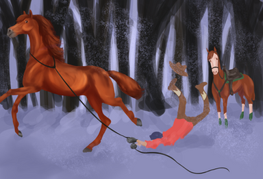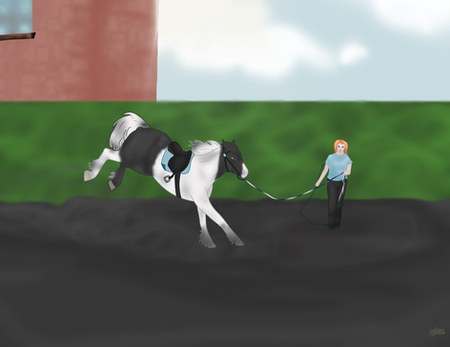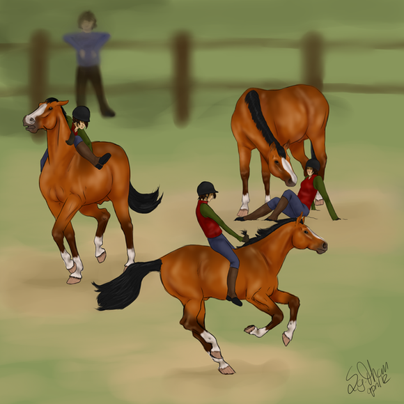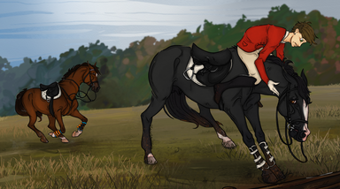 "But Mik!" Siobhan whined, trudging after her, only to stop and stare at the ring as the horse baulked a good few meters before a jump. The saddle was obviously loose, slipping. The young teenager slipped out of the saddle and started yelling at the horse, waving her whip around like a baton- going so far as to strike the stallion's neck and chest- though it was obvious she was going for his raised head.