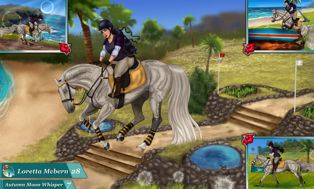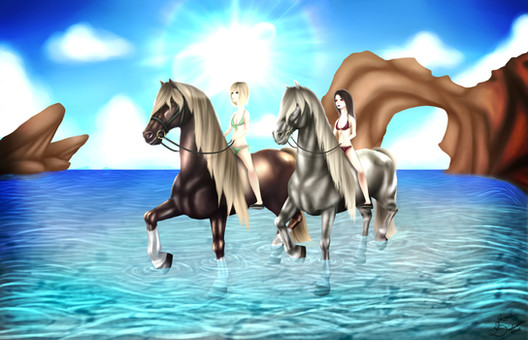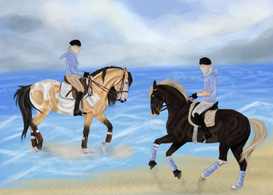 The sound went off and the horses that were ready bolted past the rock formations and down the grassy knoll and sandy dunes. Firestorm raced through the sand, though the deeper the sand was, the more they sunk in and slowed a little, to the point where Mikayla urged the mare closer to the water where the sand was firmer. Many people had the same idea, as they were soon almost in two rows of riders racing against each other. As another rider tried to push them to the side- to get the lead off them, Firestorm half-leapt into the water, crossing ahead of them- confusing the rider and their horse as they hadn't expected the waler to leap past them from the front and towards the water.