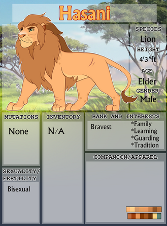 By all standards, Dhani was a fair and good king; he treated his subjects well, respected the circle of life, and was a good father and husband...Kinda. His dark not-so-secret and downfall was his paranoia concerning his death. His mjuzi foretold that the cub of his daughter will murder him and in his fear he came to the decision to not marry off any of his daughters but to keep them as his own brides instead. His logic being that every other tale of a king fortuned to be killed by his spawn was wrongfully thought killed or banished, hence, if he kept his children close and he treated them well they would not conspire against him and he can avoid his fate.