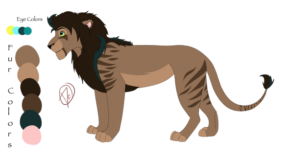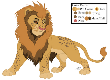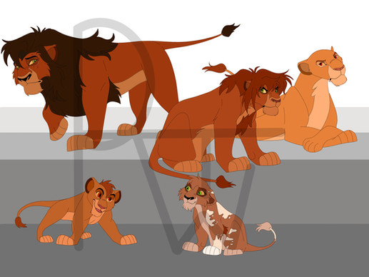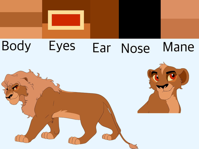 The reddish mane that grows darker with a more golden pelt like Mohatu, I added the darker cheek colours like Mufasa has in the movies but more exaggerated. I also tried to make him have a weird skinny adolescent phase that made him look more like Scar but an adult look that looked like a healthy mix of both parents.