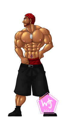 Clothes: Kilt, Hooded Jacket, Tanktop, Boots (just below his knee)