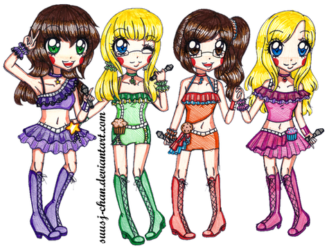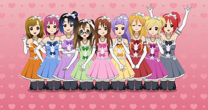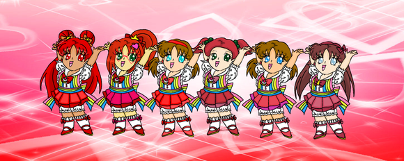 ME ENCAAAAAAAAAAAAAAAANTA el dibujo en general. Es un poco, el típico dibujo del Fanimator Team con mucho colorido y ropa muy random, pero la verdad es que me gusta mucho, es justo el tipo de dibujos que me gusta hacer. Se me hizo difícil colocar a tanta gente en el lineart, cuando terminé me di cuenta de que me faltaban dos personas y yo FREAKIN' OUT porque no encontraba donde meterlas xDDDDDDDDDDD Pero al final puse a todo el mundo. Después está el problema de que el reliner no funcionaba y que el lápiz estaba demasiado marcado, así que tuve que estar limpiando en el PS todas las marcas del lápiz para que luego el dibujo quedara medio decente. Después, el coloreado... Pues nada del otro mundo. Me gusta como quedó, usé la misma técnica que en el otro dibujo. Sólo cambié una cosa en los HL del pelo. Y bueno, el fondo... El dibujo está inspirado en la canción de AKB48 Everyday, Katyusha! De ahí el título xDDDDDDDDDD Y bueno, esa canción me recordó a la música para Ciudad Marina en Pokémon Diamante, y quería hacer un escenario modificando una foto de Ciudad Marina, pero como no se puede hacer gran cosa con una imagen de videojuego... Así que después de probar varias cosas, decidí ir con este otro escenario que se me ocurrió, uno basado en los cuadriláteros [LOL, que científico suena]. El suelo es de la textura [link] , los efectos de aquí [link] y las paredes las hice colocando imágenes de videojuegos editadas a muerte. Sí, me ha dado fuerte por los juegos, problem? xDDDDDDDDDDD Y sí también, el pixelado es a propósito. Bueno, voy a comentar ahora el diseño de cada una y el orden. Que es lo que más os interesa, vamos xDDDDDDDDD