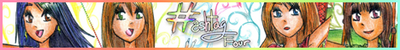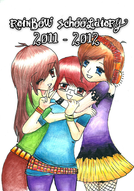 So we got the four main characters randomly placed in a colorful background which, by the way, sucks holding a poster with the title of the manga. Neat, huh? Now, I really like the poses and the general structure of the drawing, seems pretty balanced and I think I did a good job on placing the charas around I really had no idea where to put the brown-haired girl with the exclamation sign shirt, since I had nearly all of the space filled out by the other girls and the poster - happens to me all the time when drawing this kind of group pics hahahaha. The inking is OK too, I had to use a dark green pen because I ran out of black ink but it doesn't really make any difference when scanning. But the coloring... oh my god. It really, really sucks. I colored the bluenette first and that one looks fine, but the one I did the last was the exclamation sign girl, and her coloring sucks so bad hahaha.
