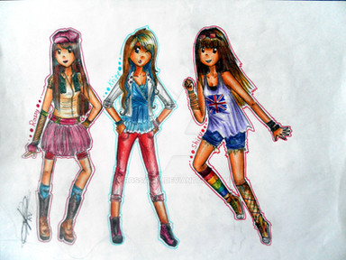 But I never drew a pic of me and Aichu in that group-ish style. So here it goes! I really like it, the clothes, the poses, the logo, everything. Aichu's clothes are really random, but I love them. She looks good in blue and green~ And I also like the idea of those circles in the background... Well, it looked better in paper xDDDDDDD Hope you like it!