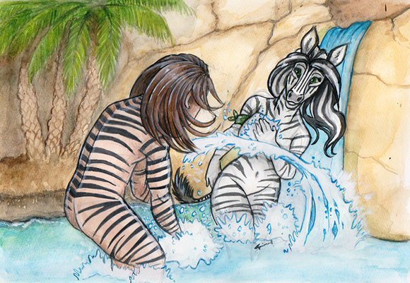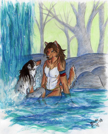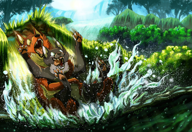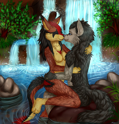 Nirrah (grey) has got a place where she really likes to spend time; that waterfall, hidden in the heart of a rainforest. She uses to visit this place quite often, when she wants to be alone, think about stuff without being disturbed (yea, she's pretty antisocial). She usually doesn't show that place to anyone, but this time she decided to take Hijera (the other hyena on the picture) there, because she gained her attention somehow and Nirrah feels like she can trust her and like they mean something to each other. Well, and this is how it ended up.Both hyenas (c) me