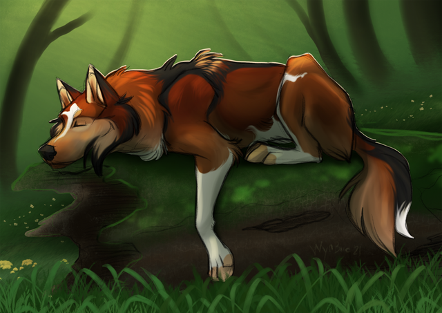 Art for StrangeKami their character Cipher sleeping in a forest on a moss bed ^^Related content