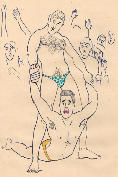 Spread 2 of the short booklet entitled "LONG LIVE THE DONG" (pictures of the booklet will be uploaded in Scraps): Wrestlers.A project exploring the visual language of sexualized male figures. In other words, men are rarely objectified in a way I'd like to see, and at best the frequency of those types of images is grossly lacking in comparison to images of sexualized women. I think all of deviantArt is a good example of this (protip: enter "nude" in the search field and you'll get what I mean).