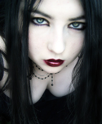 The bright blue eyes and slightly-pink lips are brought out so well by the pale skin and black hair