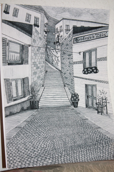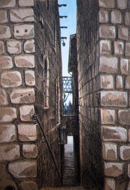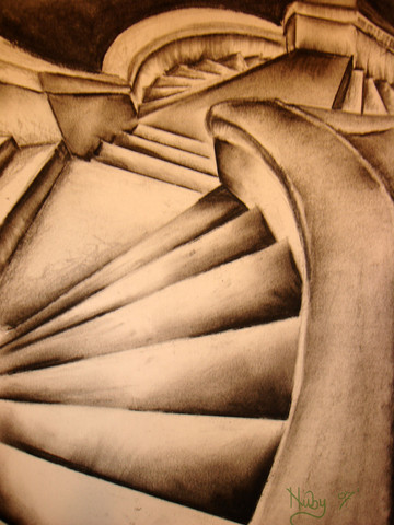 This is very well drawn. I love the use of texture on the brick walls and the stairs. Your artistic abilities amaze me!