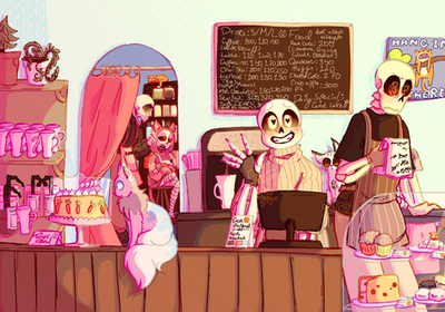 Sooo I’ve been trying to work on my layout, perspective and background skills, and here’s a result! Plus I love sansby, and I don’t see enough art of them so I guess I’m just gonna have to do it myself.Sans is embarrassed to see his family crashing his date, while Grillby is just amused