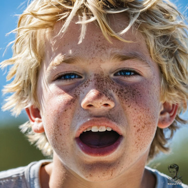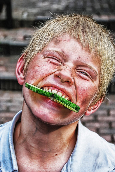 A re-edited portrait photo featuring a boy eating a chocolate snack, incorporating a fake high dynamic range (HDR) image processing technique.Model: