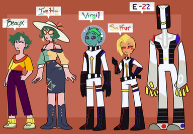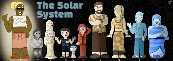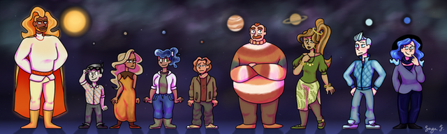 I've seen so many people do their takes on personifying the planets as people, so I'm doing my take. In fact, I actually took it one step further and developed a story idea for them. Basically, our Solar System is a galactic team that fly around the stars, helping those in need and completing missions. I didn't draw her in here, but their all around leader is the sun. XD Alright, from left to right, here are the planets:Mercury: Once a messenger of the stars, now pilot for a team of plants in his solar system. He's quite wise-cracking and fluid, but don't get on his bad side - his temper is horrid when provoked.