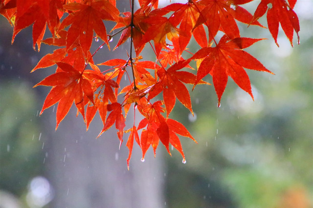 Looks like your failed photo excursion ended well after all! This is a truly amazing capture. The slight blur of the raindrops adds so much extra dimension and makes it stand out from other leaf shots. I'm also in love with the stark contrast of orange and black, one of my favourite colour combos. This is simply "dripping" with autumny atmosphere!